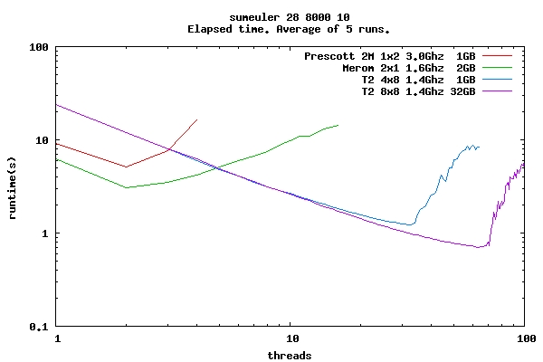 The system currently works well for small programs, such as computing a dot product or the product of a sparse matrix with a dense vector. For such applications, the generated code is as close to hand written C code as GHC’s current code generator enables us to be (i.e., within a factor of 2 or 3). We ran three small benchmarks on an 8-core x86 server and on an 8-core UltraSPARC T2 server, from which we derived two comparative figures: a comparison between x86 and T2 on a memory-intensive benchmark (dot product) and a summary of the speedup of three benchmarks on x86 and T2. Overall, we achieved good absolute performance and good scalability on the hardware we tested.